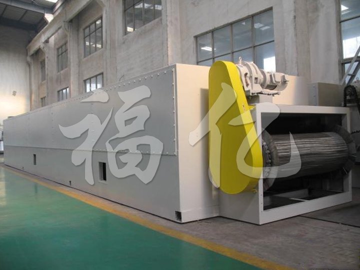 整個生產(chǎn)線為全封閉型(對物料而言),由擺動布料段、干燥段、出料段三部分組成。擺動布料段作用使海藻均勻分散在網(wǎng)板上,并且勻速輸送到干燥段,海藻經(jīng)過80℃熱風干燥段,90℃熱風干燥段和120℃熱風干燥段后,再經(jīng)過出料段排料。循環(huán)風向及各單元內(nèi)風的循環(huán)為向下式,即加熱后的空氣由引風機吸入,在風機出風口首先預分布再經(jīng)過孔板均風后,熱風從物料的下面向上(或從物料的上面向下)穿透物料層。